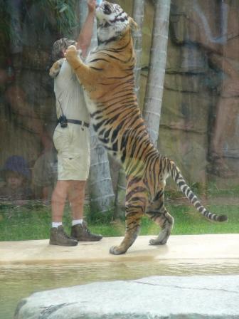 Op een bewolkte dag hebben we halsoverkop besloten om een bezoekje te brengen aan de zoo van Steve Irwin, je weet wel, die gekke crocodile hunter die ironisch genoeg vermoord is door een stingray ! In ieder geval, de Aussies zijn echt gek op hem, best niets slechts zeggen over die krokodillen-freak ! We waren weliswaar sterk verbaasd hoe een leuke zoo hij heeft, of had beter. Op een gegeven moment lopen we door de zoo en komt er ineens een cheetah naast ons gewandeld aan de leiband! Zodat die beestjes ook eens wat anders zien als hun kooi ! Eenmaal bij de Tiger Temple beland, denken we eventjes dat het bij de tijgers misgelopen is ! We zien een medewerker van de zoo in het tijgerzwembad spartelen, samen met 2 andere tijgers ! oei oei paniek ! Niet dus... Omdat ze de tijgers wat willen bezighouden zitten die mensen heel de dag samen met de tijgers in de kooi. Die aaien de lieftallige katjes, spelen "apporte" met de bal (als je het mij afvraagt spelen ze life bait!), een beetje dollen en koprollen ! We hebben 2 uur staan kijken omdat we zo onder de indruk waren !