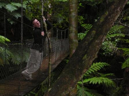 Vorige week woensdag zijn we onze auto gaan afhalen, een Huyndai Elantra 2.0. We hadden geluk, normal kregen we een kleiner model: een Huyndai Accent 1.5. Die extra halve liter longinhoud hebben we al goed kunnen gebruiken in de bergen richting Lamington National Park. Een uur lang over smalle bergweggetjes, genre 14% omhoog en net niet breed genoeg om te kunnen passeren. Ellen had natuurlijk pech, ze zat aan de afgrond-kant schrik te hebben. Eenmaal aangekomen in het park, hebben we een korte wandeling gedaan. Aangezien het bijna etenstijd was, hadden we ze maar ingekort. Terug aangekomen aan het hotel, kwamen we erachter dat er een uurverschil is tussen provincie New South Wales (waar Sydney is) en Queensland (waar we nu zitten) en we dus een uur te vroeg waren teruggekomen. Dat uurverschil betekent dat het hier nu al om zeven uur donker is! En niet gewoon donker, maar echt donker-donker. Gelukkig is het al terug licht om vijf uur 's morgens ... In Lamington hadden we de kans om te wandelen ter hoogte van de bomen, een tree top wandeling. Denk aan de wandeling in Planckendael, maar dan hoger en veel mooier. Twintig meter boven de grond, met pieken tot dertig meter! Op zo'n hoogte heb je wel een geweldig uitzicht over de omgeving. Ellen bedankte vriendelijk voor de hoogte en heeft een wandeling over de begane grond gedaan.