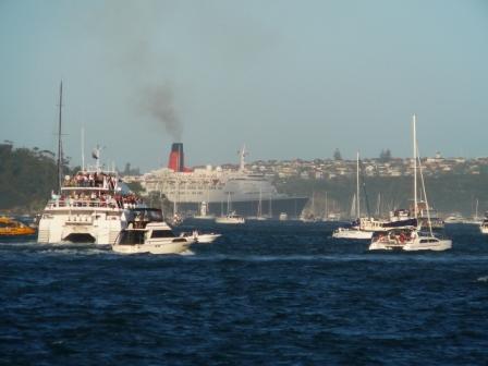 Deze week is de gigantische Queen Mary II hier aangemeerd, het grootste cruiseschip ter wereld. Te groot om onder Harbour Bridge aan de Opera House te kunnen en te groot om aan de normale cruiseschipsteiger aan te meren. 's Avonds kwam de Queen Elizabeth II aan en het was van WW2 geleden dat deze samen in de stad waren (toen waren het wel oorlogsschepen). Elke boot in de stad was uitgevaren om deze te begroeten. De ferries leken maar klein naast deze mastodonten. Reken daarbij nog een dozijn helicopters die rondcirkelden en je kan je misschien wel voorstellen wat voor een drukte dat geweest moet zijn! Er waren wel 4.000 Aussie's afgezakt tot de harbour! 's Avonds, na zonsondergang, was er een gigantisch vuurwerk, een kwartier lang, dat was heel mooi. Sydney was één verkeerschaos omdat die 4.000 mensen ineens allemaal op hetzelfde moment naar huis wilden. Een ticketje voor een wereldreis van 81 dagen met QM2 kost rond de 500.000 dollar!