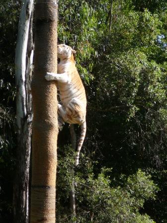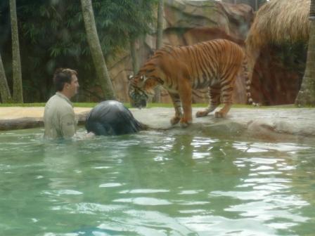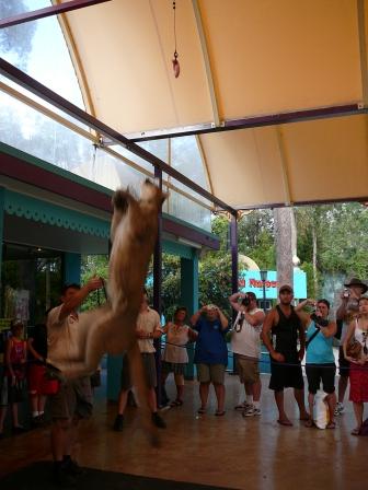 Op een bewolkte dag hebben we halsoverkop besloten om een bezoekje te brengen aan de zoo van Steve Irwin, je weet wel, die gekke crocodile hunter die ironisch genoeg vermoord is door een stingray ! In ieder geval, de Aussies zijn echt gek op hem, best niets slechts zeggen over die krokodillen-freak ! We waren weliswaar sterk verbaasd hoe een leuke zoo hij heeft, of had beter. Op een gegeven moment lopen we door de zoo en komt er ineens een cheetah naast ons gewandeld aan de leiband! Zodat die beestjes ook eens wat anders zien als hun kooi ! Eenmaal bij de Tiger Temple beland, denken we eventjes dat het bij de tijgers misgelopen is ! We zien een medewerker van de zoo in het tijgerzwembad spartelen, samen met 2 andere tijgers ! oei oei paniek ! Niet dus... Omdat ze de tijgers wat willen bezighouden zitten die mensen heel de dag samen met de tijgers in de kooi. Die aaien de lieftallige katjes, spelen "apporte" met de bal (als je het mij afvraagt spelen ze life bait!), een beetje dollen en koprollen ! We hebben 2 uur staan kijken omdat we zo onder de indruk waren !