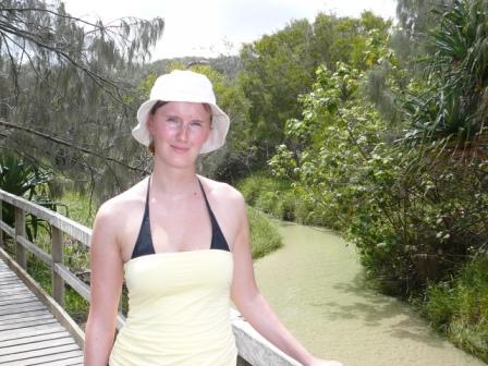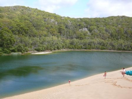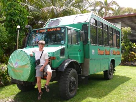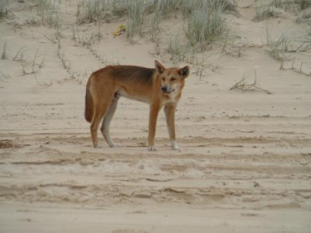 Dinsdag en woensdag hebben we een georganiseerde tour gedaan op Fraser Island, het grootste zandeiland ter wereld. We zaten in een heel toffe groep met reizigers van onze leeftijd. We hebben hard gelachen met een Canadees koppel en een Zweed. 's Nachts hebben we in een tent geslapen, maar met een houten vloer en echt bed! De douches en toiletten deden daarentegen wel weer aan scoutskamp denken. Fraser Island is geweldig mooi, met stranden-uit-de-boekjes en zeer mooie uitzichten. We hebben zelfs wilde Dingo's (=wilde honden) gezien, volgens de gids "de zuiverste Dingo's uit Australie". Weten we dat ook weeral. Ook hebben we (eindelijk) onze eerste wilde slang gezien, spijtig genoeg een niet-giftige. De gids was wel een speciaal iemand. Ik heb nooit geweten dat je met een 4x4-bus zo snel door de bossen kan rijden! We hebben een paar keer bijna vastgezeten in het zand, dan deden we een kwartier over vijf meter! Gewoon plankgas geven en heel traag vooruit bibberen met een motor die net niet overhit is. Het strand van Fraser Island is trouwens de hoofdweg van het eiland, wat best wel grappig is, aangezien daar ook de normale regels gelden (max 80km/h) en het tegelijkertijd een vliegveld is. Dan moet je als chauffeur wel opletten, hoor.
