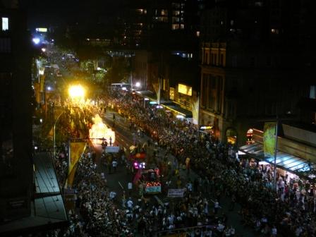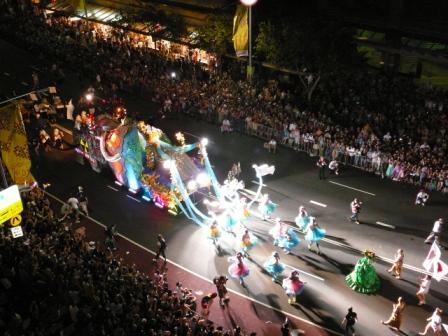 Op onze allerlaatste avond in Sydney werden we weeral getrakteerd op groot spektakel! Mardi Grass is een soort van 'love parade', een grote parade waarvan Disneyland nog iets kan leren ! Zoals eerder gezegd was ons appartement in het hart van het homoseksuele leven gesitueerd, dus vanuit ons appartement had je het beste zicht op de hele parade ! Er waren een stuk of 350.000 mensen afgezakt tot deze delen van de stad , wat een massa volk zeg ! Het thema van de parade was de glitter & glamour van Kylie Minogue. Na honderden homo's in veel te blootgevende spannende pakskses en perfect uitgevoerde danskes gezien te hebben (natuurlijk op Kylie muziek), zal voor Dries zijn favoriete Kylie nooit meer hetzelfde betekenen ! Soit, er was soms iets te veel bloot van niet al te flatterende figuren, maar we hebben er toch een heel leuke avond van gemaakt en gedanst op ons balkonnetje!