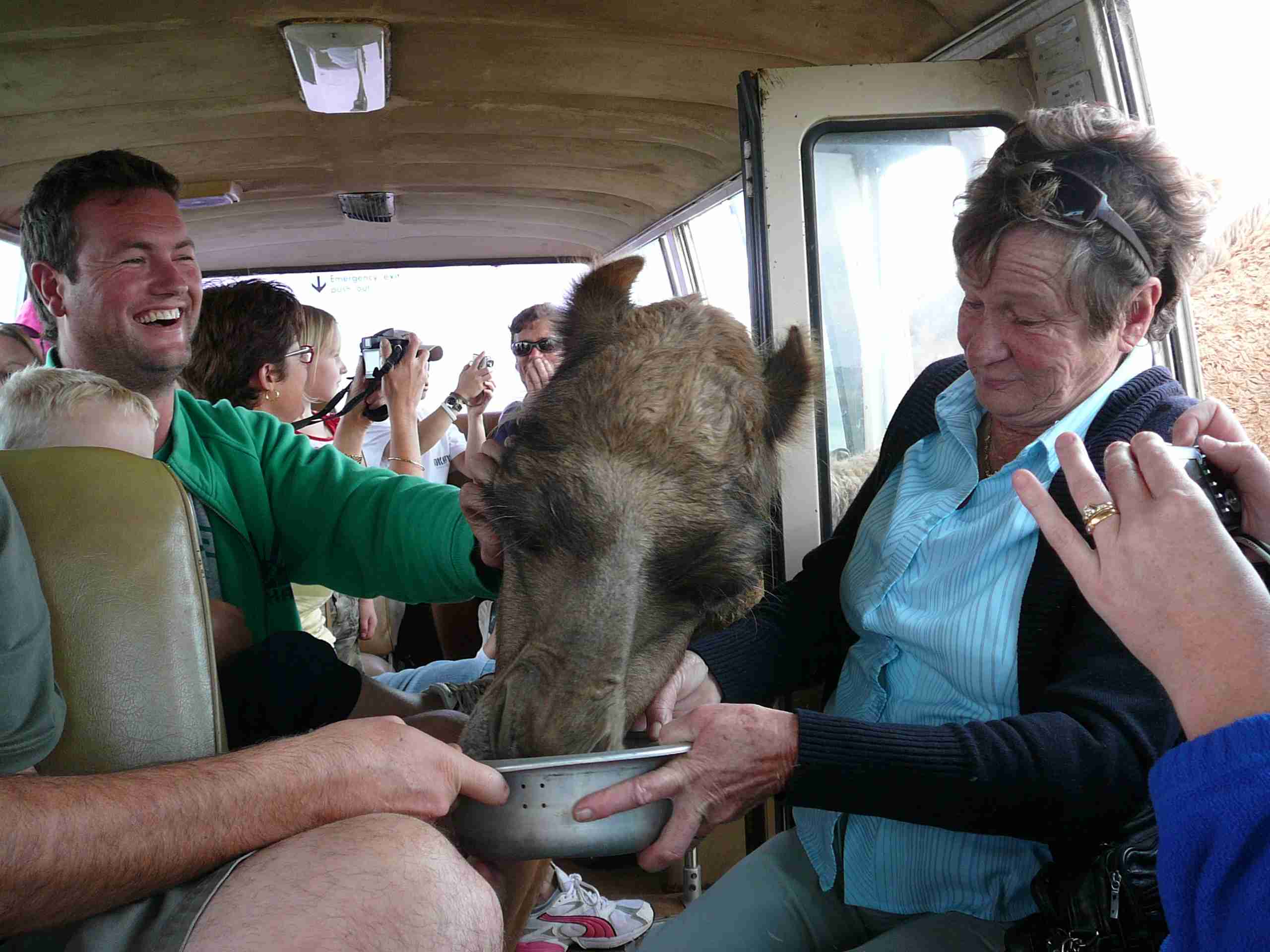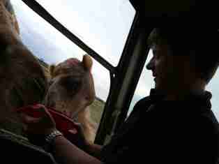 In Esperance zijn we op boerderijbezoek geweest, en wat voor een boerderij: een grote rommelhoop! De rondrit gebeurde in een afgedankte bus waarvan ramen en deuren niet meer dichtgingen. We arriveerden net op tijd en mochten vooraan in de bus springen, iets waarvoor we later zeer dankbaar waren. Na een aai-stop bij de alpaca's (een lama-achtig beest) gingen we naar de buffels. Gigantische, Afrikaanse en Italiaanse buffels die volgens ons zonder al te veel moeite de bus konden slopen (voorzover dat dat nog niet gebeurd was). Na het betere offroad-werk met de bus die daar duidelijk niet voor gemaakt is, komen we terecht bij de dromedarissen. Meteen werd ook duidelijk waarom de bus vol stukjes wortel en hoopjes graan lag en wat de reden is achter niet-sluitende deuren en ramen! Het was hilariteit alom, toen er drie dromedariskoppen binnenkwamen! De volgende stop was bij de struisvogels, die om een of andere duistere reden samenhokken met de elandstieren. Ooit met een bus een hoop struisvogels opgejaagd? Wij nu wel. Tegen 50 km/h over een hobbelig weiland op 10 cm afstand van deze giganten rijden, het heeft wel iets. Verlegen zijn ze allerminst en aangezien de raampjes niet dichtgaan, moet je zorgen dat ze niet aan de waardevolle spullen geraken. Op een Australische boerderij wordt ook heel goed duidelijk dat een paar meter grond absoluut niets kost (in de outback toch niet): in elke weide moeten ze gaan zoeken naar de dieren!