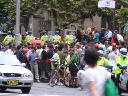 Misschien was het ook in het Belgische nieuws, misschien ook niet, maar hier ging het er continu over: Dick Cheney was op bezoek! En bezoek van Cheney is blijkbaar een goede reden om te betogen en te vechten. Terwijl wij, na een zware werkdag, uit de metro kwamen, was er een grote protestactie bezig tegen de Iraksituatie en voor David Hicks (een Australische moslimfundementalist die al vijf jaar in Guantanamo Bay zit). Het moet wel gezegd worden dat het hier propere mensen zijn, een vijftal meter achter de betoging liep de kuisploeg al!